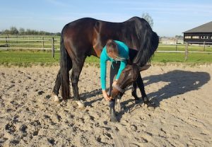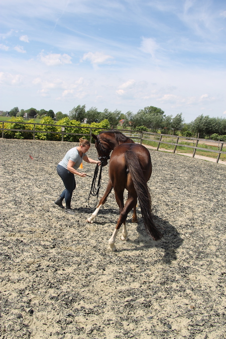 Je gaat met je rug tegen je paard staan. Net achter de schouder. Je zet één been naar voren en laat je paard helemaal opzij, naar beneden en iets naar voren, richting jouw knie buigen. Hij mag niet wegdraaien met de achterhand.